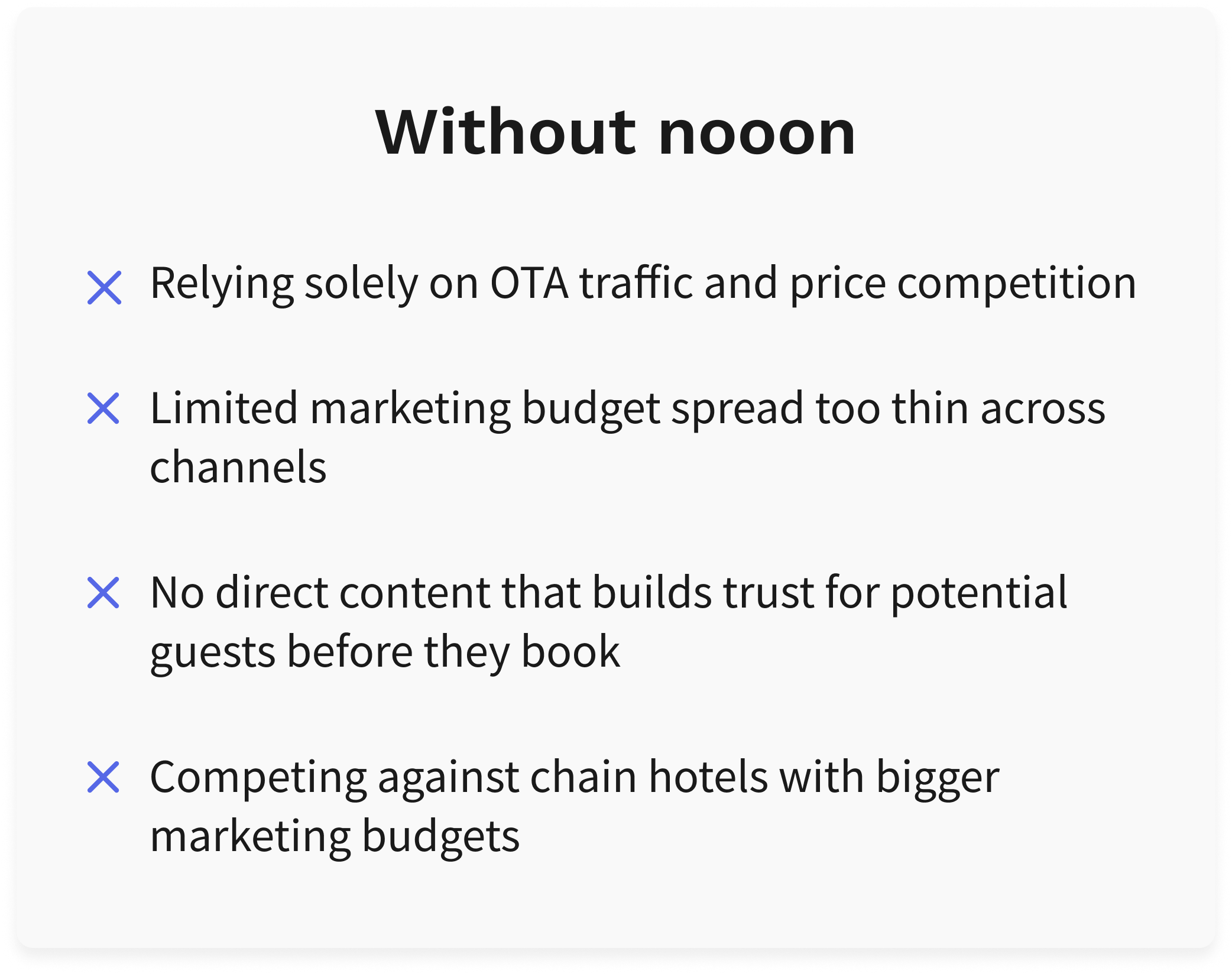 Book a 15-minute call to see how other independent hotels are using nooon to increase direct bookings and build brand awareness.